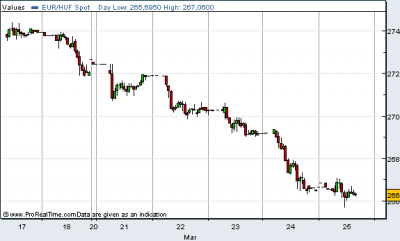 Piaci vélemények szerint a forint árfolyama az erőteljes ellenállási határnak tekintett 270-es euró jegyzési küszöb átlépésével új mozgási tartományba helyeződött át, amit az euróövezettel szembeni befektetői bizalom alakulása függvényében meg is tartat, bár ilyen mértékű erősödés után egy korrekciós fázis nem okozhat meglepetést.