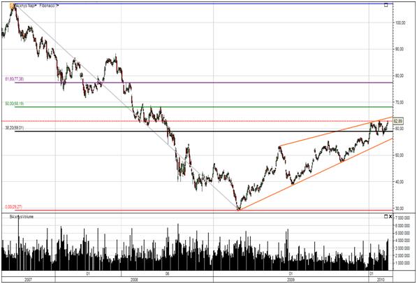 Technikailag is jól látható, hogy magas forgalommal tudott kilőni a részvény. Egyelőre az emelkedő ék alakzat továbbra is él, de ezzel egyetemben a felső ellenállás is 64$-nál. Nagy kérdés, hogy a mai piacnyitás milyen hangulatban fog történni. Érdekes lesz!!!