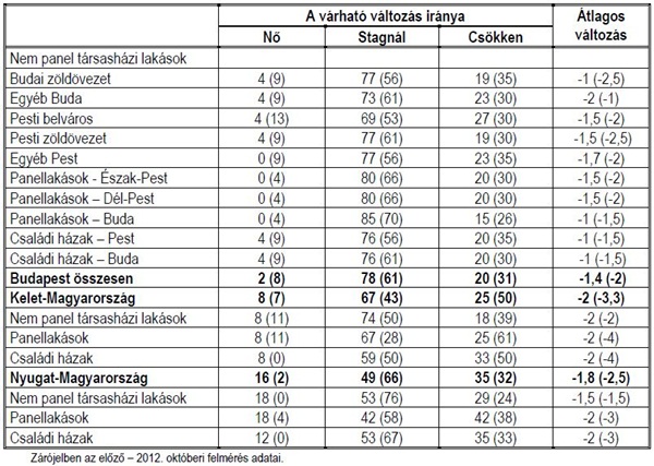 A használt lakásokra nézve a válaszadók többsége – a nyugat-magyarországi panelek kivételével – a következő 12 hónapban stagnáló árakat vár. A további árcsökkenésre számítók aránya minden szegmensben számottevő, az áremelkedést prognosztizálók aránya minimális. Az összesített prognózisok a használt lakások árának további 1,5-2%-os csökkenését valószínűsítik a következő 12 hónapban.