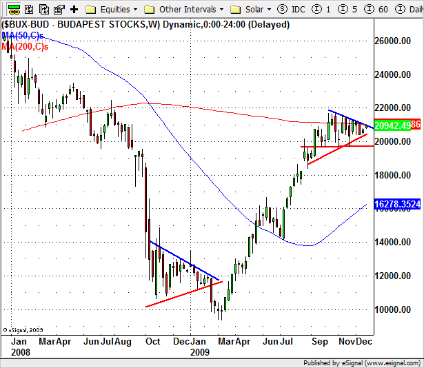 A Budapesti vezető részvényindex a fejlődő piacok jellegzetes padlófogását élte meg 2009 elején, gyakorlatilag 2003-as mélységekbe süllyedt, majd erőteljes emelkedésbe kezdett, amellyel a veszteség felét sikerült is ledolgozni, de az utolsó negyedévben megtorpant. (Solar Capital)