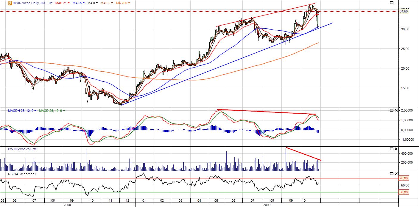 Egyre jobban érik a Bwin részvényeiben is a korrekció. Egyelőre itt sokkal biztatóbbnak tűnik a helyzet. Bár tegnap megtesztelte az ellenállást, gyorsan vissza is húzták az árfolyamot, ezzel betöltötték a rést, amit nyitáskor hagyott maga után.