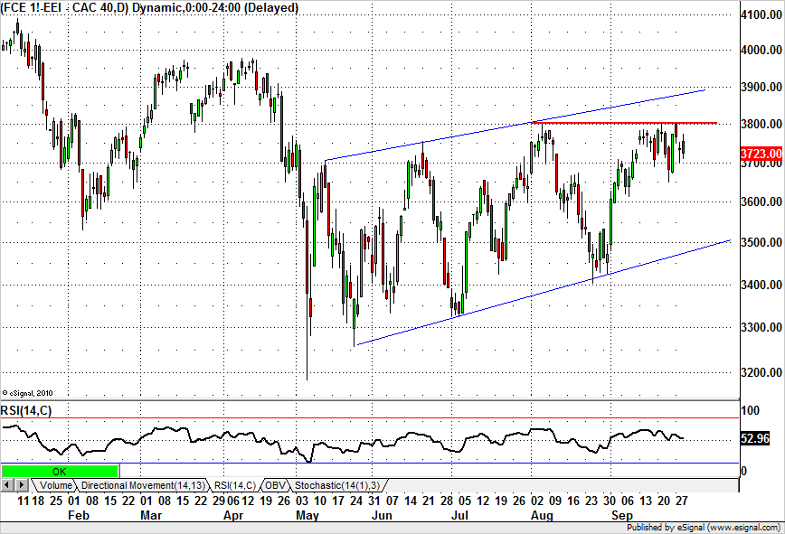 Az európai részvényindexekkel összhangban nem tudott kitörni az ellenállás szintről a francia részvényindex határidős terméke sem. Hétfőn pont a 3800-as kritikus szintnél nyitott, de akkor ennél magasabbra nem is jutott az árfolyam és azóta sem tud még csak támadó pozíciót sem felvenni. Ha mégis sikerülne 3800 fölött zárnia, akkor a sáv teteje lenne a cél 3870 környékén. (Solar Capital)