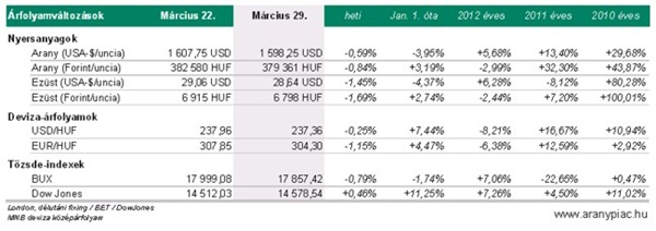Az arany árfolyama a március végével zárult idei első negyedévet negatív eredménnyel fejezte be. Ez sorozatban a második mínuszos előjelű negyedév, amire 2001 óta nem volt példa az aranyár legújabb kori történetében. Halványan pislákoló fény ugyanakkor az alagút végén, hogy a március már enyhe 1%-os áremelkedést hozott a nemesfém számára. A szerény mértékű felértékelődés a Ciprus kapcsán ismét fokozottan előtérbe került euróválság számlájára írandó. Amint azonban az akut válság elült, máris kezdett erejét vesztve kifulladni az árfolyam-emelkedés. Jól érzékelhető, hogy válsághírek híján múlik az érdeklődés az arany mint menedékdeviza iránt, de az is látszik, hogy a vissza-visszatérő befektetői félelmek egyik napról a másikra képesek felfelé fordítani az árfolyam irányát.