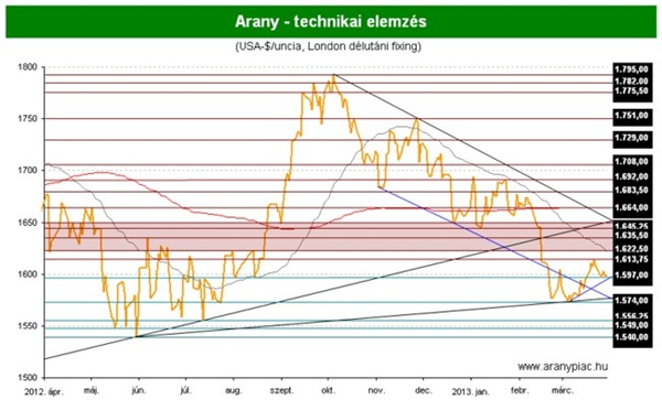 Az arany árfolyama közvetlenül a négyhetes emelkedő trend vonalához érkezett meg. Amennyiben ez alá esne be a kurzus, úgy további lemorzsolódással kellene számolni 1.574 dollárig. Az árfolyam még ennél is mélyebbre való visszaesése esetén az 1.540 dolláros vízszintes támaszvonalnak jutna döntő szerep a lejtmenet megállításában. Ahhoz, hogy egy ellenkező irányú forgatókönyv váljon valóra, mihamarabb 1.600 dollár fölé kéne visszatérnie a jegyzésnek, majd sikerrel ütközni 1.613 dollár magasságában egy ellenállással. Csak e fölött oszlanának a viharfellegek valamelyest az arany felett, míg igazán derűs égboltról az 1.620 és 1.650 dollár között húzódó ellenállási zóna átvágása esetén lehetne beszélni. Ez egyidejűleg a hat hónapja tartó csökkenő trend megtörését is jelentené.