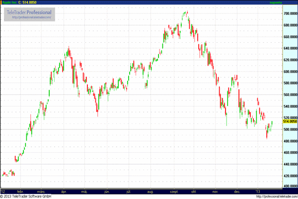 A vállalat árfolyama a szeptemberben elért közel 700 dolláros csúcsához képest több, mint negyedével esett már vissza. A tegnapi rendes kereskedés során a papír jegyzése 1,83 százalékkal 514,01 dollárra emelkedett. A gyorsjelentést követő eladói nyomás annak köszönhető, hogy a negyedik negyedéves értékesítése elmaradt az elemzői várakozásoktól. Az iPhone készülékekből 47,8 millió darabot értékesített a vállalat, ami ugyan 28 százalékos bővülés, azonban némiképp elmaradt a 48 millió darabos elemzői várakozásoktól. Ez volt az első teljes negyedév, mióta piacra került az iPhone 5 készülék.