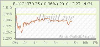 A BUX 14.34 órakor 21.370,35 ponton állt, ami a legutóbbi, csütörtöki záró értékéhez képest 74,24 pontos, 0,36 százalékos csökkenés, a hétfői nyitásnál 41,02 ponttal alacsonyabb. A részvénypiac forgalma fél háromig 9,8 milliárd forint volt, a vezető részvények vegyesen mozogtak az előző napi záráshoz képest.