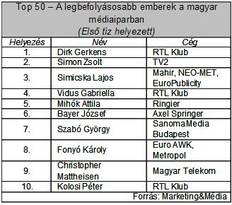 Az idei „Top 50 – A legbefolyásosabb emberek a magyar médiaiparban” lista összetétele ugyan több mint harmadával változott, az élboly ugyanakkor viszonylag stabil maradt. A korábbi évekhez hasonlóan megőrizte vezető helyét Dirk Gerkens, az RTL Klub vezére. A szintén a cégcsoportnál dolgozó Vidus Gabriella egy helyezést javítva idén a negyedik lett, Kolosi Péter pedig a 10. helyre került. Simon Zsolt, a TV2 első embere megőrizte korábbi második pozícióját, míg a képzeletbeli dobogón új szereplő Simicska Lajos, aki a Mahir, NEO-MET és EuroPublicity érdekeltségein keresztül a harmadik legmeghatározóbb személyiség a médiaiparban, a tavalyi hetedik helyről erősödve egészen idáig. A sajtópiacon helycsere történt, az Axel Springert irányító Bayer Józsefet megelőzte Mihók Attila, a Ringier ügyvezetője. Szabó György, a Sanoma Media Budapest vezetője tavalyhoz képest két helyezést lépett előre, idén a hetedik. Érdemes kiemelni az első tízből új szereplőként Christopher Mattheisent, a Magyar Telekom vezérigazgatóját, aki idén a kilencedik helyet foglalja el, valamint Fonyó Károlyt (Metropol, Euro AWK), aki a zsűri döntése alapján a nyolcadik legbefolyásosabb szereplő a hazai médiaiparban.