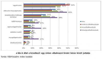 A kkv vezetők elmondása alapján az is látható, hogy a cégmérettel párhuzamosan növekszik a béren kívüli juttatásokat nyújtó vállalkozások aránya. Míg a mikro vállalkozások kevesebb, mint fele (48%) alkalmazza a cafeteria elemeket, addig a kisvállalkozásoknál 58%, a középvállalkozásoknál pedig 64% ez az arány. Főként a nagyobb cégek sajátossága az egészségpénztári, illetve az önkéntes nyugdíjpénztári befizetés. A mikro-, és kisvállalkozásoknál kevésbé alkalmazott két juttatási forma a középvállalkozások körében meglehetősen népszerű, hiszen az egészségpénztári befizetést a középvállalkozások 20%-a, nyugdíjpénztári kiegészítést pedig a 17%-uk tervez nyújtani az alkalmazottaknak.