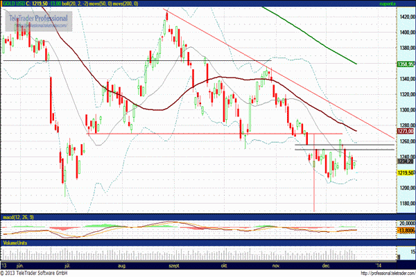 Az arany árfolyama a Fed bejelentését követően- mely szerint az eszközvásárlási program mérete az eddigi 85 milliárd dollárról 75 milliárd dollárra csökken - lefelé mozdult. Ugyan a QE3 méretének januártól várható csökkentésének tegnapi bejelentése meglepte a piacokat, azonban mivel a lassítás mértéke nem drámai mértékű, így a nemesfém piacát elkerülte az "azonnali halál". Az amerikai pénznyomda lassulása, az erősödő dollár és a mérsékelt infláció ugyanakkor csökkenő pályát jelöl ki az arany számára.