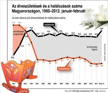 Az előzetes adatok szerint 2012 első két hónapjában 14 679 gyermek született, 3,3 százalékkal több, mint egy évvel korábban. A halálozások száma 22 614 volt, ami 3,1 százalékos csökkenést jelent a 2011. január–februárihoz képest. A természetes fogyás 7935 fő volt, 1194-gyel kevesebb az egy évvel korábbinál. A születésszám januári kismértékű emelkedését követően februárban 6,6 százalékkal több újszülött jött világra, mint egy évvel korábban. A szökőnaphatástól megtisztított születésszám-emelkedés ennél kisebb mértékű, 1,6 százalékos volt.
