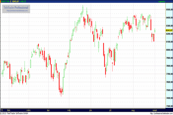 A múlt hét már tömeges vételi profitrealizálásban és óvatos short próbálkozásokban telt már el a német DAX kereskedésében. Nem meglepő módon hétfőn a közel 90 pontos réssel felfelé nyitás mellé összességében 160 index ponttal feljebb keveredett pénteki záróárához képest délutánig a kurzus. Így hagyva nyitva egy tátongó potenciális cél zónát lefelé. A 8240-es szintekről nézve 25 - 50 - 100 - 120 pont hívogatja a shortokat tervező tradereket.
