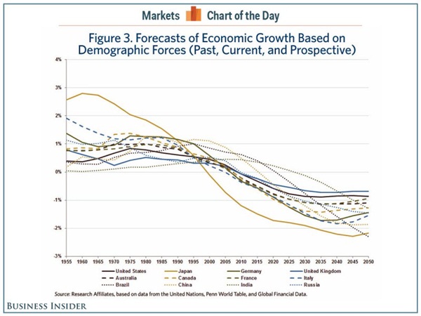 Az öregedő népesség hatása a GDP-re a legjobban Japánban tetten érhető: míg az 1960-as évek elején a demográfiai folyamatok még 3 százalék körüli mértékben járultak hozzá a gazdaság növekedéséhez, addig az 1980-as években már csak 1,5 százalékig, ma pedig már ugyanilyen mértékben csökkentően hatnak (lásd grafikonunkat). A világ többi részén is fokozatosan mérséklődik a GDP-hez való hozzájárulás, Kína, Olaszország és Németország egyaránt a negatív tartományba került. Mindebből az következik, hogy míg a demográfiai folyamatok az elmúlt évszázad közepéig jelentős lökést adtak a vezető gazdaságoknak, akkor ez a trend megtört, s mára eljutottunk odáig, hogy már egyre inkább fékezőleg hatnak. A gazdaságpolitikáknak ehhez kell alkalmazkodniuk – állítják a kutatók, hozzátéve: nem is a lassabb gazdasági növekedés az igazi veszély, hanem a várakozások alakulása. Ha senki nem számít gazdasági növekedésre, akkor a magánszemélyek, a vállalatok és az állam is előrehozhatják fogyasztásukat, azok nagy részét hitelből finanszírozva, amivel a már így is súlyosan eladósodott országok terhei csak még tovább növekednek.