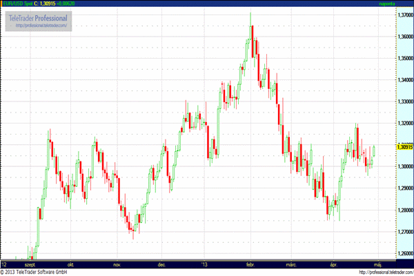 EUR/USD (1,2960 – 1,3160): Egész héten az 1,2950-1,31-es sáv volt a jellemző a devizapárban. Ezen az egyet jobbra, egyet balra állapoton semmilyen hír, vagy adat nem tudott változtatni, még a vártnál gyengébb, 2,5%-os előzetes első negyedéves amerikai GDP adat sem. A fékezett habzású gazdasági növekedés a mennyiségi lazítás (QE3) jelenlegi formájában való továbbélését valószínűsíti, minden esetre a piaci szereplők árgus szemekkel fogják figyelni a FED-nek a munka nemzetközi ünnepére eső kamatdöntő ülését követő közleményét. Az elmúlt hetek nyilatkozatai alapján több izgalomra csütörtökön Európából számíthatunk.