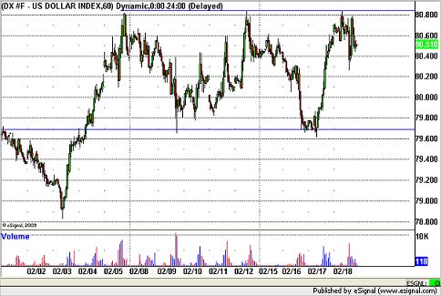 A dollár mozgása február eleje óta egy néhány dolláros sávba szorult, ami az órás grafikonon szépen nyomon követhető. A megelőző trend alapján a sávból nagyobb valószínűséggel jön felfele kitörés, amihez jelenleg kedvező az elhelyezkedése is.