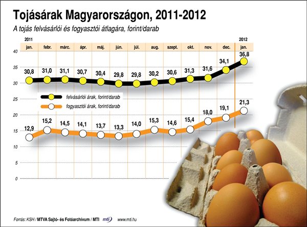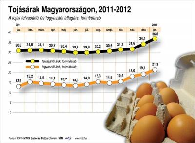Az Országos Kereskedelmi Szövetség (OKSZ) hétfői közleménye szerint a tojás ára 55 százalékkal emelkedett az egy évvel korábbihoz képest. Ennek oka, hogy az uniós "ketrecszabály" miatt kevesebb a tojás egész Európában. Uniós összegzés szerint 10-15 százalékkal csökkent a tojástermelés 2012 eddig eltelt időszakában, ez hetente 200 millió darab kiesését jelenti a közösségi piacon.
