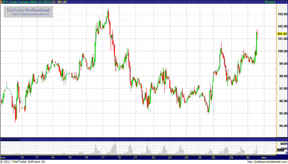 A nyugati féltekén irányadó WTI fajta ára 1,37 dollárral 101 dollár fölé emelkedett keddi záróárához képest. Az északi-tengeri Brent 69 centtel 111 dollárra drágult. Mindkét kontraktus november 17-e óta a legmagasabb szintre emelkedett abban a reményben, hogy a likviditásbővítő lépések révén gyorsulhat a globális gazdasági növekedés.