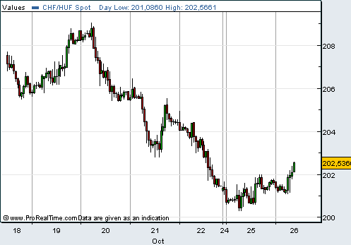 CHF/HUF (200,50 – 203,00): Hangzatos sajtócímekkel ellentétben nem volt 200 alatt a frank/forint árfolyam. Az EURCHF korrigált 1,36 alá és jelenleg is ott tartózkodik, így a forint oldalazása mellett nincs sok esély, hogy ma sikerülne a bravúr.