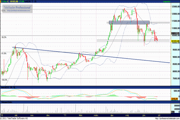 Ha a szintet letöri - melyre a lefelé nyíló Bollinger-szalag alapján van esély - akkor tovább eshet 9350 forintig. Emelkedés során ellenállás továbbra is 10.500 forintnál.