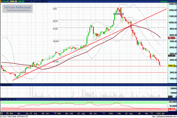 Az elmúlt két hétben mutatott csökkenéssel ismét visszatért a Bollinger-szalag alsó szárához, ha a 3000 forintos szintbe nem tud megkapaszkodni, akkor a túladottság ellenére is folytatódhat a csökkenés 2000 forint irányába.