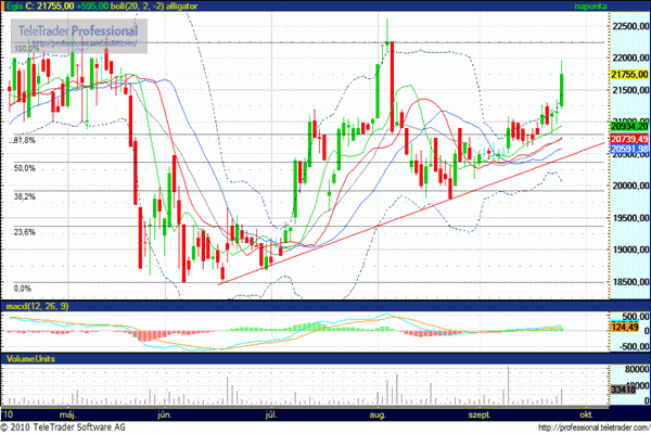 Sokat kellett várni, de végre csak elindult határozottan felfelé az árfolyam. Ugyan még szeptember 9-én átlépett a 20.800 forintos ellenállási szinten, de a továbblépéshez némi konszolidáció kellett. A pénteki kiugrás után már joggal várható a 22.250, 22.620 forintos szint elérése. Csökkenésben támasz 21.400 forintnál.