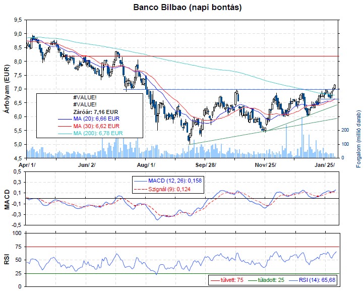 Kilőtt a bankpapír árfolyama, miután áttörte a féléve ellenállást jelentő 7 eurós szintet. Megerősítést kaptunk az irányt illetően, ha a kitörés nem hal be a napokban, akkor a következő hetekben is emelkedésre számíthatunk. A 200 napos mozgóátlag hét eleji áttörése is a pozitív képet erősíti, ráadásul fontos ellenállások nem láthatók a papír útjában.