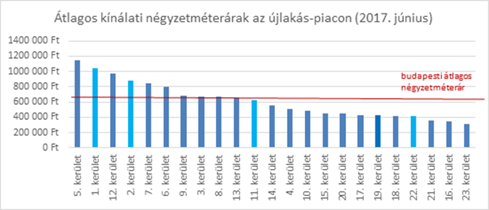 A 2017. június végi adatok alapján a legalacsonyabb áron a XXIII. kerületben vásárolhatunk, itt átlagosan 315 ezer forintos négyzetméteráron kínálják a lakásokat, míg a legdrágábbnak az V. kerület számít, ahol közel négyszer ennyibe, 1,1 millió forintba kerül egy négyzetméter. A városközpont közelében fekvő zöldövezeti kerületek közül Zuglóban vásárolhatunk a legkedvezőbb áron. Itt átlagosan 550 ezer forintba kerül egy négyzetméter, szemben például a budai III. kerületben mért 670 ezer forintos szinttel.