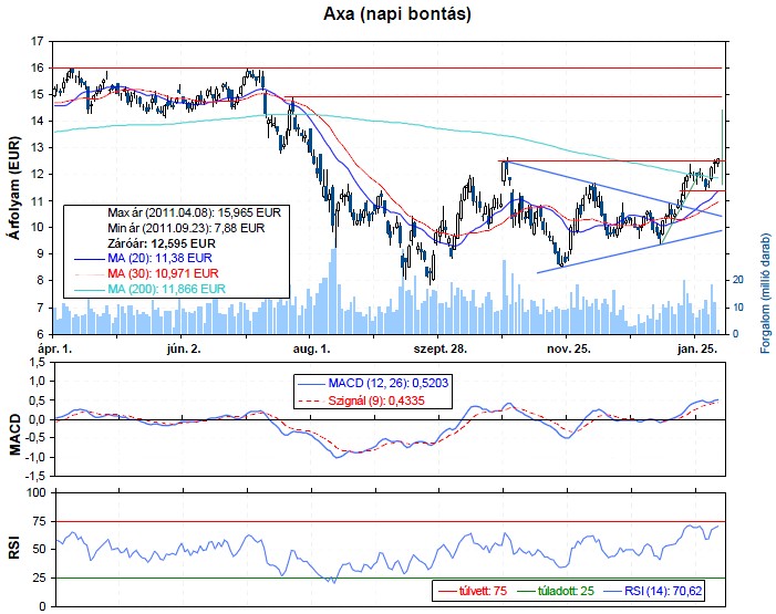 Az év első hetében lejtmenet vette kezdetét a papírban. A rossz hangulat azonban nem tartott sokáig, a 9,4-es minimumról rally üzemmódba kapcsolt az árfolyam. Az emelkedés azóta is töretlen, ráadásul fontos ellenállások felett tartózkodik az Axa.- Miután az árfolyam kitört a szűkülő alakzatból, gyorsan elérte a 200 napos mozgóátlagot, amelyet pár nap birkózást követően leküzdött.