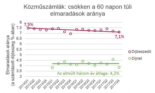 Miközben a Díjbeszedő Holding által kiállított közműszolgáltatói számlák (vízmű-, csatorna-, földgáz-, szemétszállítási, valamint kéményseprési szolgáltatások) esetében a két hónapnál hosszabb elmaradás jelenleg összességében a díjösszeg 7,1 százalékát érinti, ezen belül a Díjnet elektronikus rendszerén keresztül fizetendő számlák tekintetében az elmaradás jóval kisebb, átlagosan 4,2 százalék. Ebben szerepet játszhat az, hogy az elektronikus számlabemutatást és -fizetést igénybe vevők eleve tudatosabban kezelik pénzügyeiket, emellett a Díjnet rendszere minden számla lejárata előtt figyelmezteti is az ügyfeleket a közeledő fizetési határidőre, így esetükben nem fordulhat elő olyan mulasztás, ami például egy-egy elkallódó csekk vagy hagyományos számlalevél esetében gyakori jelenség.