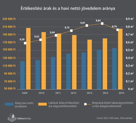 2015-ben az ország egészét tekintve átlagosan 13,8 százalékkal nőtt a lakások értékesítési ára, a nettó bérek esetében azonban mindössze 3 százalékos emelkedés volt megfigyelhető. Ennek hatására tehát érezhetően kevesebb négyzetméternyi lakást vásárolhattunk egyhavi fizetésünkből 2015-ben, mint 2014-ben. A grafikonon feltűntetett trendvonal és az arányszámok elárulják, hogy egy havi átlagbérből mennyi négyzetméternyi ingatlant vásárolhatunk, ha azok átlagárával kalkulálunk. Világosan látszik, hogy az előző évekhez képest romlott a helyzet, hiszen 2014-ben több négyzetméterre volt elegendő a fizetésünk, mint a tavaly.