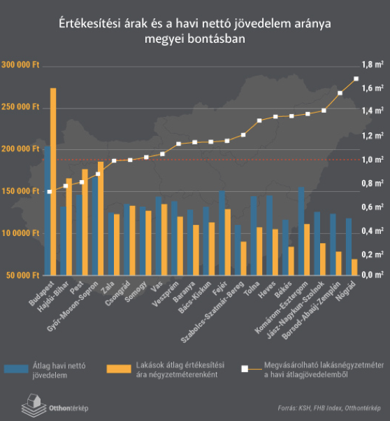 Az Otthontérkép megyei bontásban is megvizsgálta az értékesítési ár és a nettó jövedelem viszonyát. A legnehezebb helyzetben ebből a szempontból a budapesti lakásvásárlók vannak, hiszen havi fizetésükből kevesebb mint 1 négyzetméternyi ingatlanra futja. Az ingatlanárak területi különbségei itt is erősen megmutatkoznak. Jó példa erre Nógrád megye, ahol csaknem 2 négyzetméterre telik egy havi nettó fizetésből. Ez azonban nem a magas béreknek tudható be, sokkal inkább az ingatlanállomány alacsony árszínvonala okozza.
