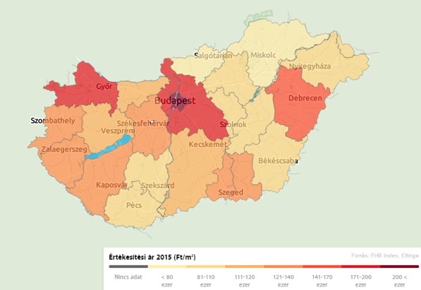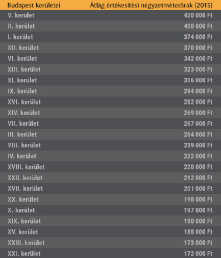 Az ingatlanárak emelkedése leginkább a fővárost érintette, itt ugyanis 2014-hez képest minden kerületben legalább 15%-kal nőttek a négyzetméterárak. A legdrágább kerületnek az V. és a II. kerület bizonyult, ahol több mint 400 ezer forintos négyzetméterárakkal találkozhatunk. A legolcsóbb városrészek a XXIII. és a XXI. kerület, ahol valamivel több mint 170 ezer Ft/négyzetméteres árral lehetett kalkulálni.