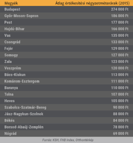 „Megyei viszonylatban igen erőteljes szórással találkozhatunk a négyzetméterárakat illetően. A legdrágábban Budapesten cseréltek gazdát az ingatlanok, átlagosan 274 ezer Ft/négyzetméteres áron. Ezt követi Győr-Moson-Sopron és Pest megye. A legalacsonyabb összeget (kevesebb mint 85 ezer forintot) Békés, Borsod-Abaúj-Zemplén és Nógrád megyében kellett fizetni egy négyzetméter otthonért” – mondta el Fodor Szabolcs az Otthontérkép elemzője.