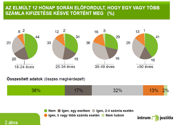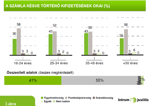 A kutatás adatai alapján a határidőn túl fizetett számlák között a mobiltelefon- és internetszámlák, valamint a közüzemi díjak állnak a vezető helyen, míg a legpontosabban a gyerekekkel (óvodai és bölcsödei költségek, tandíj) és a lakhatással kapcsolatos költségeket fizetik a magyarok.