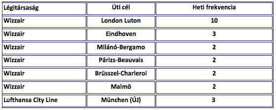 Menetrendszerinti járatok 2016-ban Debrecen Airportról: