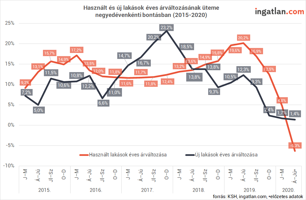 Az ingatlan.com elemzése a hivatalos adatokat idézve azt írja, hogy a használt lakások az éves árcsökkenés ellenére a 2015-ös szinthez képest 60 százalékkal voltak drágábbak a második negyedévben, az előző negyedévhez képest 8 százalékos volt a hanyatlás. Az új lakások ára éves szinten 1,4 százalékkal még növekedni is tudott.