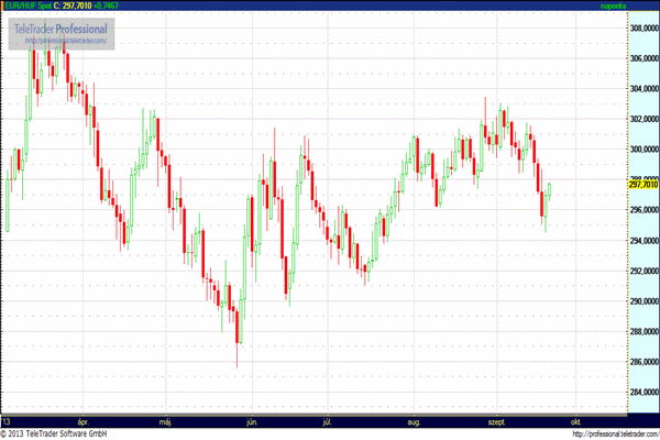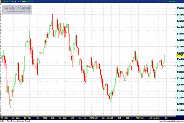 EUR/USD (1,3460 – 1,3620): Szinte meg sem mozdult tegnap a legfőbb devizapár árfolyama. A piacok még mindig a FED döntését emésztgetik, próbálják kitalálni, hogy a jövőben milyen adatok, tényezők alapján alakulhat az amerikai monetáris politika. A tanácstalanság oka, hogy Bernanke egyik nyári nyilatkozata alapján a FED-nek csökkenteni kellett volna a likviditásbővítés keretösszegét, vagy legalábbis utalást tenni ennek időpontjára. Mivel ez elmaradt sokakban felmerülhet az az érzés, hogy a FED úgy válogathatja meg a lépés időzítésének szempontjait, ahogy az neki tetszik. Növelheti a bizonytalanságot, és csökkentheti a kiszámíthatóságot, ha a piacnak nem lesz sorvezetője.