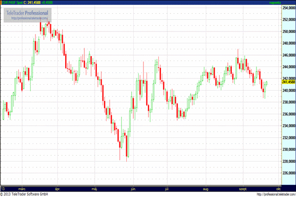 CHF/HUF (238,50 – 243,50): Folytatódott a frank oldalazása, és a következő hetekben is az 1,23-1,24-es szintek közötti sávozásra számíthatunk. A forint mozgása lehet meghatározó tényező ebben a devizapárban. A tegnapi 240 alatti szintek nem tartottak sokáig, ma reggel már a 241-es szinteken kezdünk.
