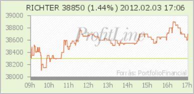 A Richter papírok árfolyama 550 forinttal, 1,44 százalékkal 38.850 forintra emelkedett, a részvények forgalma 980,5 millió forintot ért el. A másik gyógyszeripari részvény, az Egis 145,8 millió forintos forgalom mellett 20 forinttal, 0,12 százalékkal 17.220 forintra növelte értékét. A BUMIX 1.317,76 ponton zárt pénteken, ez 0,74 pontos, 0,06 százalékos csökkenés a csütörtöki záráshoz viszonyítva. (MTI)