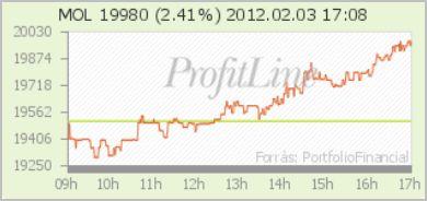 A Mol 470 forinttal, 2,41 százalékkal 19.980 forintra erősödött, 2,6 milliárd forintos forgalomban. Az OTP részvények ára 50 forinttal, 1,20 százalékkal 4.110 forintra csökkent, forgalmuk 8,0 milliárd forintot tett ki. A Magyar Telekom árfolyama 1 forinttal, 0,18 százalékkal 547 forintra nőtt, forgalma 494,1 millió forint volt.