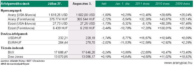 Erre a hírre az euró árfolyama gyengülni kezdett a dollárral szemben, általános eladói hullám vette kezdetét a befektetési piacokon, és a dollárerősödés nem utolsó sorban az 1.600 dolláros lélektanilag fontos szint alá rántotta vissza az arany árfolyamát. Hogy a sárga nemesfém mégis viszonylag jól tudta tartani magát mindezek mellett, az már-már a relatív erő jele, hiszen éppen a nemesfémeknél voltak talán a legfelfokozottabbak a várakozások az egyes európai politikusok és jegybanki vezetők egy héttel korábbi erős mondatai után. Ezek után kérdés jelenleg, hogy valóban beindul-e, és ha igen, mikor, az újabb bankóprés az eurózóna kötvényeinek felvásárlására. Az arany relatív ereje annál is inkább szembetűnő, hogy pénteken a vártnál kedvezőbb amerikai munkaerő piaci adatok láttak napvilágot, ami a tengerentúlon sem teszi indokolttá egyelőre a pénzpolitika lazítását. A sárga nemesfém mindezek ellenére 1.601 dollárig visszaerősödve, éppen a lélektani küszöb felett tudta zárni a londoni kereskedésben a hetet.