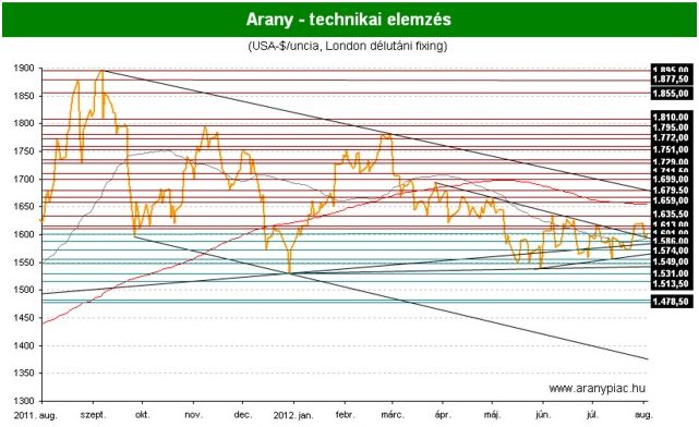 Az elmúlt hét az aranynál kevésbé a fundamentumokról szólt, mintsem a spekulációról valamint a vevők és eladók közötti csatározásról a lélektanilag fontos 1.600 dolláros árszint körül. Az árfolyam görbéje az utóbbi napokban látott esés ellenére egyelőre változatlanul a május végén indult rövidtávú emelkedő trendvonal felett helyezkedik el. Szolid támaszra az elkövetkezendőkben 1.586 dollár környékén számíthatnak a jegyzések, az első áttörendő ellenállás pedig 1.610 dollár magasságában várakozik.