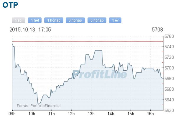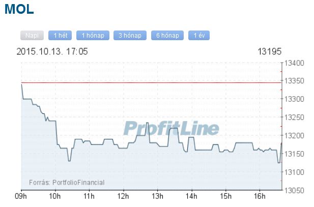 A Mol ára 150 forinttal, 1,12 százalékkal 13 195 forintra csökkent, 1,5 milliárd forintos forgalomban. Az OTP-részvények ára 42 forinttal, 0,73 százalékkal 5708 forintra esett, forgalmuk 3,7 milliárd forintot tett ki.