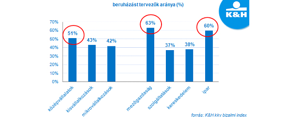 ától. Legnagyobb arányban a mezőgazdasági és az ipari szektorban számíthatunk fejlesztésekre (63% és 60%) a következő egy év során. A kereskedelmi és szolgáltató cégek közel azonos arányban, de az előbb említett szektoroknál jóval visszafogottabban terveznek beruházni (38% és 37%). Az agráriumban és az iparban nem meglepő módon elsősorban gépi, míg a kereskedelmi és szolgáltató szektorban az informatikai fejlesztéseken van a hangsúly.
