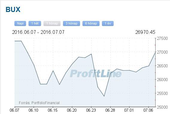 A Budapesti Értéktőzsde részvényindexe, a BUX 479,43 pontos, 1,81 százalékos emelkedéssel, 26 970,45 ponton zárt csütörtökön. A részvénypiac forgalma 13,4 milliárd forint volt. A Mol 725 forinttal, 4,34 százalékkal, 17 425 forintra erősödött, 5,0 milliárd forintos forgalomban. Az OTP-részvények ára 117 forinttal, 1,85 százalékkal, 6445 forintra nőtt, forgalmuk 5,2 milliárd forintot tett ki. A Magyar Telekom árfolyama 2 forinttal, 0,46 százalékkal, 435 forintra emelkedett, forgalma 1,6 milliárd forint volt. A Richter-papírok árfolyama 25 forinttal, 0,43 százalékkal, 5765 forintra csökkent, a részvények forgalma 1,6 milliárd forintot ért el.