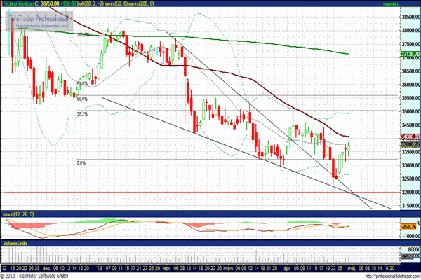 Növekvő forgalom mellett emelkedik az árfolyam, a 32.500 forintos szintnél mutatott fordulat igazán megerősítést akkor kapna, ha sikerülne túljutni a 33.800 forintos szinten, illetve az 50 napos mozgóátlagon. Ebben az esetben a következő megálló 35.000, illetve 35.500 forintnál várható.