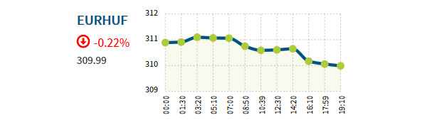 Az euró 309,96 forintra gyengült a reggeli 311,06 forintról. Napközben 309,88 és 311,11 forint között mozgott az árfolyama.