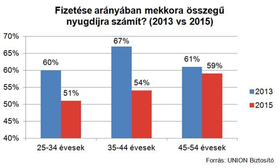 2013-ban a válaszadók átlagosan fizetésük 63 százalékára taksálták a jövőbeli nyugdíjuk mértékét. Idén ez az arány 55 százalékra csökkent, vagyis a lakosság érezhetően borúlátóbbá vált az időskori nyugellátással kapcsolatban. A válaszadók ötöde szerint a nyugdíj mértéke a 40 százalékot sem fogja elérni. A fiatalok jóval kevésbé számítanak már az állami gondoskodásra: a 35 évnél fiatalabb korosztály szerint ez az arány éppen hogy átlépi az 50 százalékos szintet.