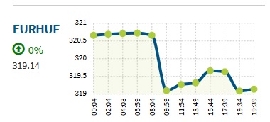 Az euró 319,20 forintra gyengült a reggeli 320,81 forintról. Napközben 318,88 és 320,91 forint között mozgott az árfolyama.