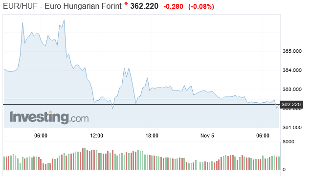 Az eurót a szerda este hét órai 362,97 forint után csütörtök reggel nyolc órakor 361,99 forinton jegyezték meg. A jegyzés október közepén állt legutóbb hasonló szinten.