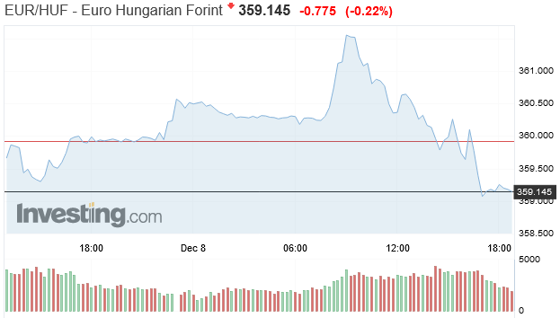 Az euró a reggel nyolc órakor jegyzett 360,33 forintról délután negyed hétre 359,24 forintra gyengült.